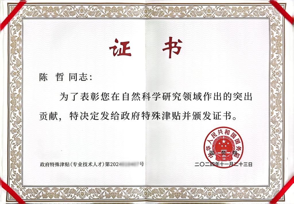 近日,经党中央、国务院批准,人力资源和社会保障部公布2024年享受政府特殊津贴人员名单,我校材料科学与工程学院陈哲教授成功获批享受国务院政府特殊津贴。国务院颁发了证书,表彰陈哲教授在自然科学研究领域作出的突出贡献。